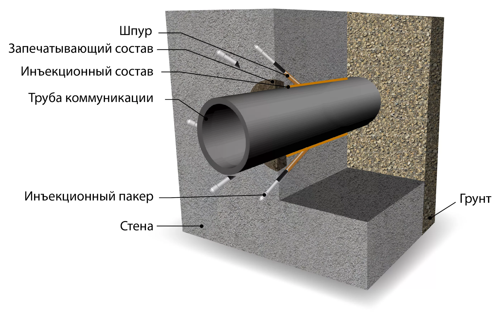 - Инъекционная гидроизоляция. Если через ввод уже поступает вода, в зазоры и пустоты нагнетают жидкие гидроизоляционные составы, которые заполняют отверстия, проникают в микротрещины и расширяются, создавая герметичный барьер.